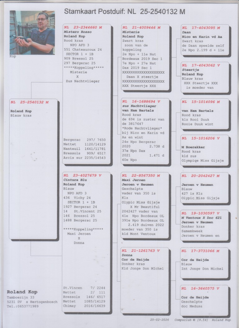 Uit: ”Mistero Rosso”, Roland Kop x ”Cintura Blu”, 7. Nat. Sector St.Vincent 2.244 d., 146. Nat. Bressols 6.517 d., lijn ”Olympic Miss Gijsje”, 1. Olympiade duif Cat. Marathon & ”Jonge Don Michel”, 1. Nat. Asduif Barcelona