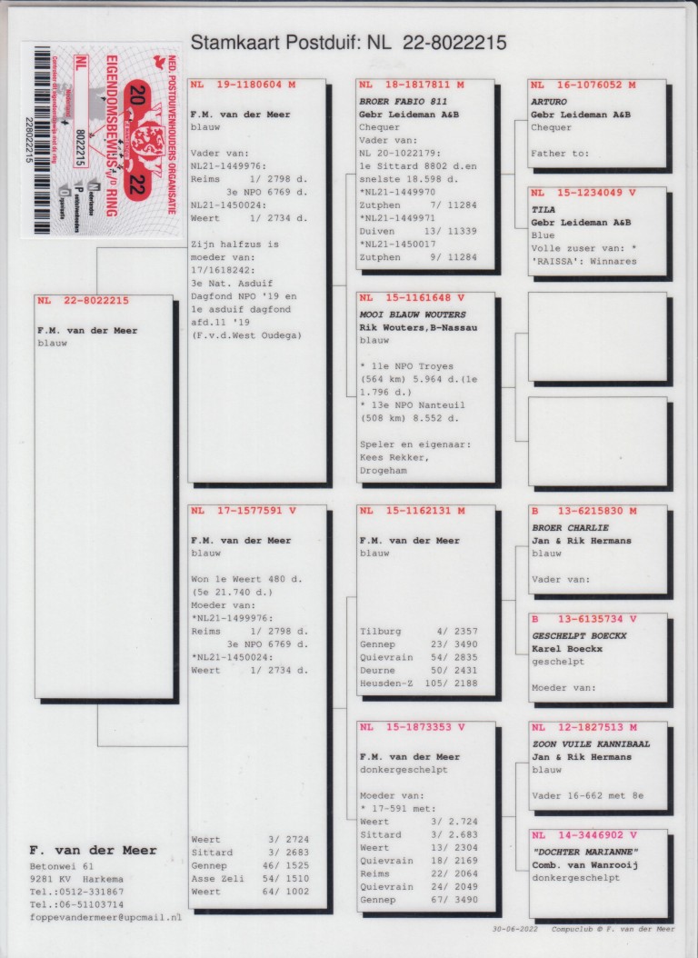 Uit: “THE 604”, vader 1.-2.798d., 1.-2.734d., 3. NPO Reims 6.769d., 1/2 sister 3. Nat. Asdduif NPO, zoon “Brother Fabio 811”, top kweker, uit “Arturo & Tila” & “Mooi Blauw Wouters”, 11.+13. NPO x “WEERT DUIFJE”, 5.-21.740d., moeder 1.-2.798d., 1.-2.734d., 3. NPO Reims 6.769d., uit zoon “Brother Charlie & Geschelpte Boeckx”.