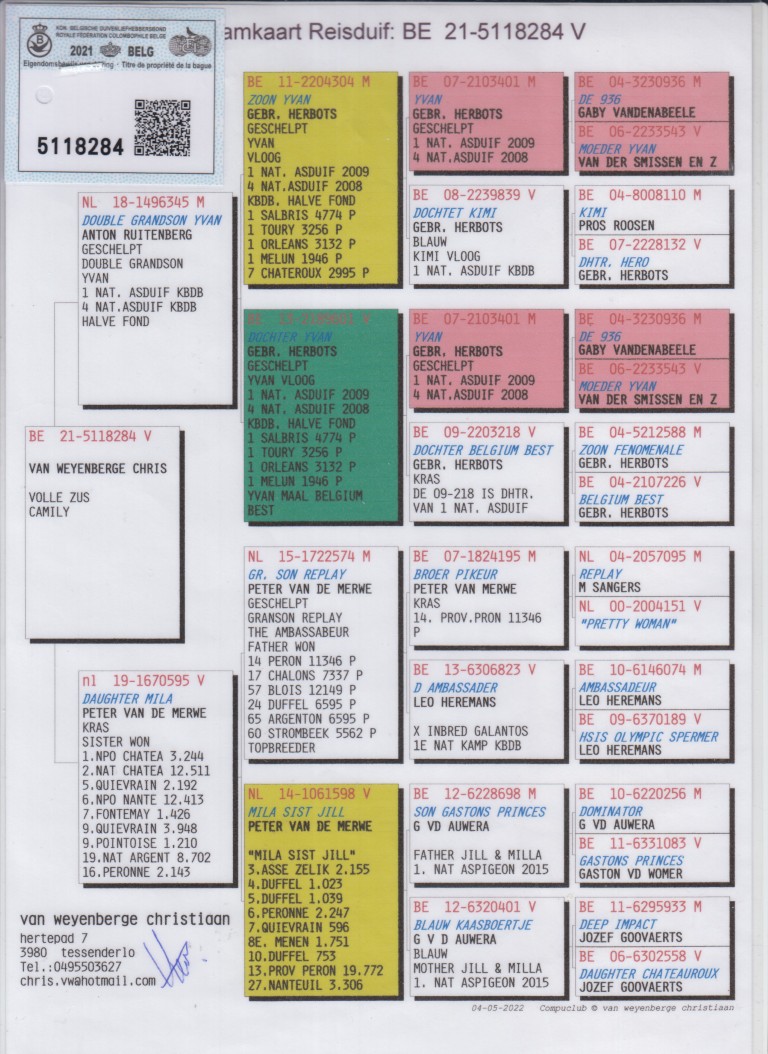 Uit: ”Double Grandson Yvan”, uit zoon & dochter ”Yvan”, 1. Nat. Asduif 2009, 4. Nat. Asduif 2008 x ”Daughter Mila”, zus 1. NPO Chateauroux 3.244 d., 2. Nat. Chateauroux 12.511 d., 6. NPO Fontenay 1.426 d., 9. Quiévrain 3.948 d.