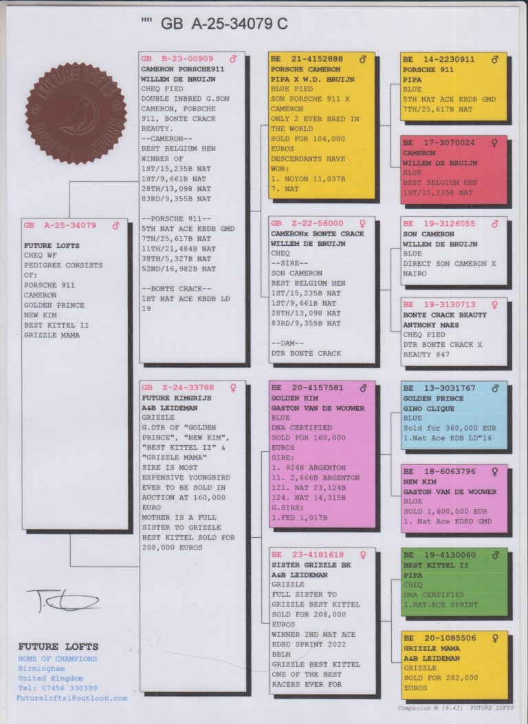 Uit: ”Cameron Porsche 911”, uit zoon ”Porsche 911” & ”Cameron”, 2x 1. Nat. KBDB x ”Future Kimgrijs”, zoon ”Golden Kim”, zoon ”Golden Prince & ”New Kim”, uit zus ”Grizzle Best Kittel”, 2. Nat. Asduif KBDB