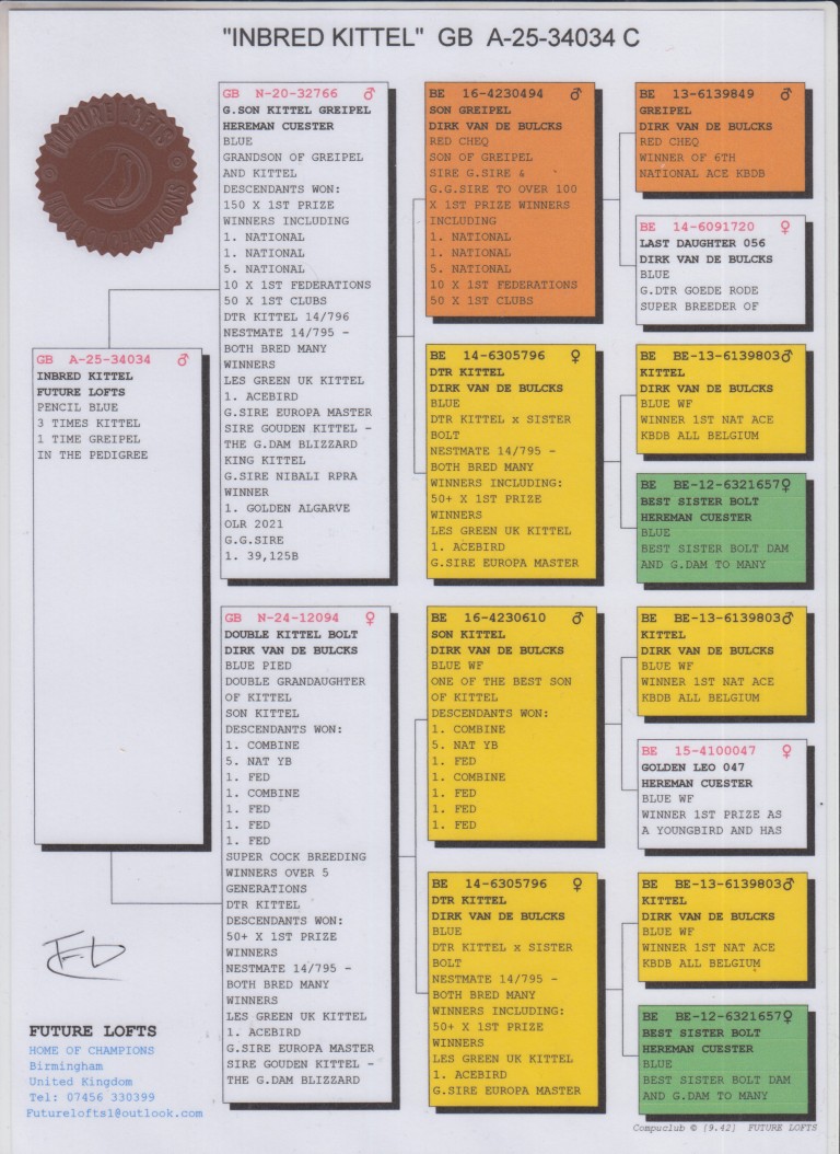 Uit: ”G.son Kittel Greipel”, uit zoon ”Greipel”, 6. Nat. Asduif Sprint KBDB, uit dochter ”Kittel”, 1. Nat. Asduif Sprint KBDB x ”Double Kittel Bolt”, uit zoon & dochter ”Kittel”, 1. Nat. Asduif Sprint KBDB & legendarische kweker
