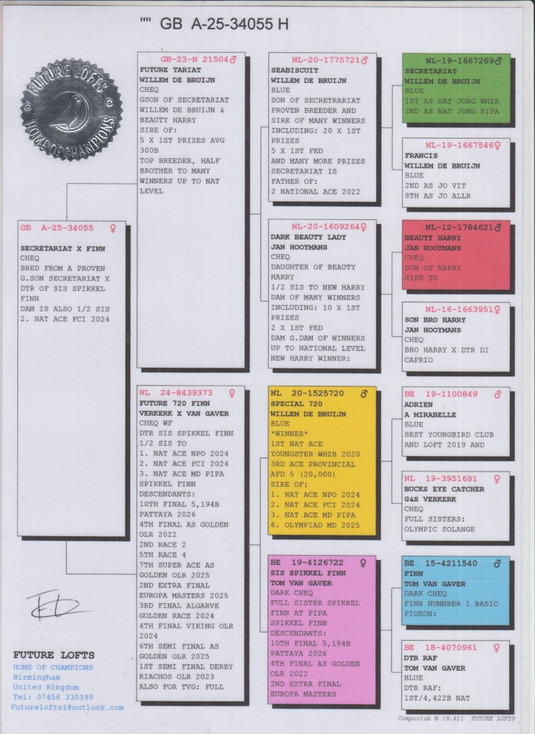 Uit: ”Future Tariat”, uit zoon ”Secretariat”, 1. & 2. Nat. Asduif Jonge Duiven & Superkweker, zoon ”Uranus”, uit dochter ”Beauty Harry” x ”Future 120 Finn”, uit dochter ”Finn”, Unieke Stamvader Tom van Gaver