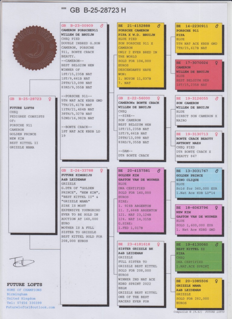 Uit: ”Cameron Porsche 911”, uit zoon ”Porsche 911” & ”Cameron”, 2x 1. Nat. KBDB x ”Future Kimgrijs”, zoon ”Golden Kim”, zoon ”Golden Prince & ”New Kim”, uit zus ”Grizzle Best Kittel”, 2. Nat. Asduif KBDB