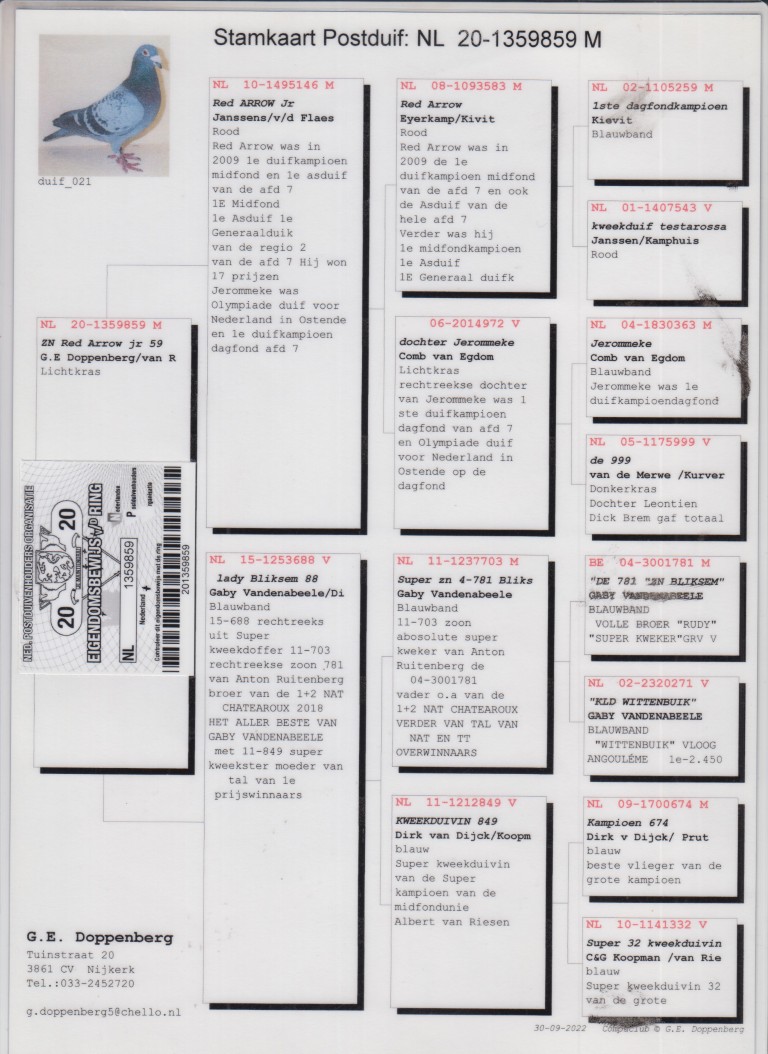 Uit: ”Red Arrow Jr.”, 1. Prov. Asduif Allround, 1. Prov. Asduif Midfond, uit dochter ”Jerommeke”, 1. Prov. Asduif Dagfond, Olympiade duif x ”Lady Bliksem 88”, uit zoon ”De 781”, zoon ”Bliksem”, Gaby Vandenabeele