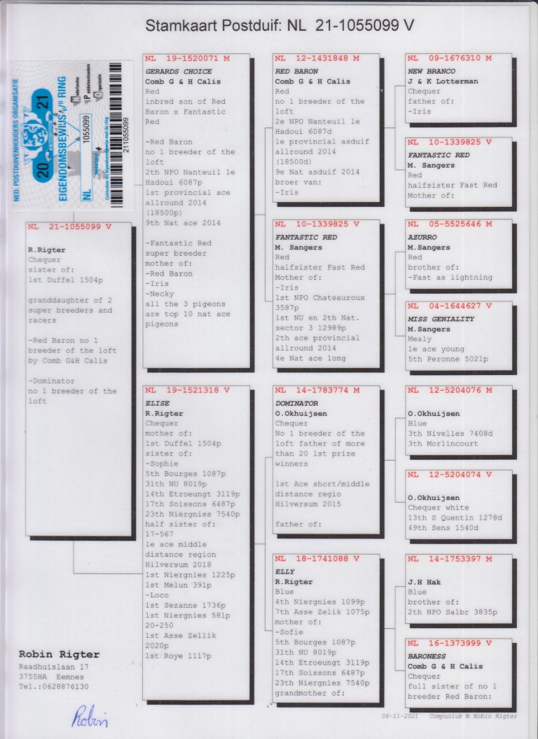 Zus 1. Duffel 1.504 d., uit: ”Gerards Choice”, G. & H. Calis, zoon ”Red Baron”, 1. Prov. Asduif Allround & Nr. 1 kweker, 1/2 broer ”Iris”, 1. NPO Chateauroux 3.587 d. x ”Elise”, dochter ”Dominator”, Stamvader Robin Rigter