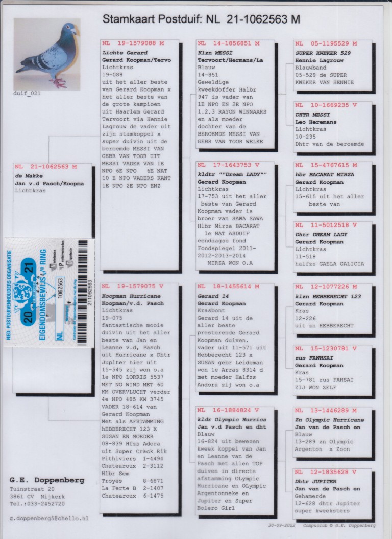 Uit: ”Lichte Gerard”, C. & G. Koopman, uit kld. ”Dream Lady”, uit klz. ”Messi” x ”Koopman Hurricane”, lijn ”Olympic Hurricane”, Olympiade duif Cat. Jonge Duiven, lijn ”Jupiter”, Stamvader Team v/d Pasch