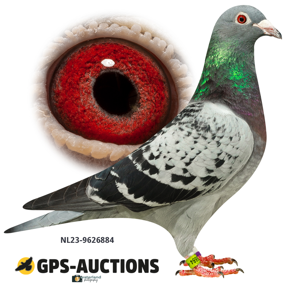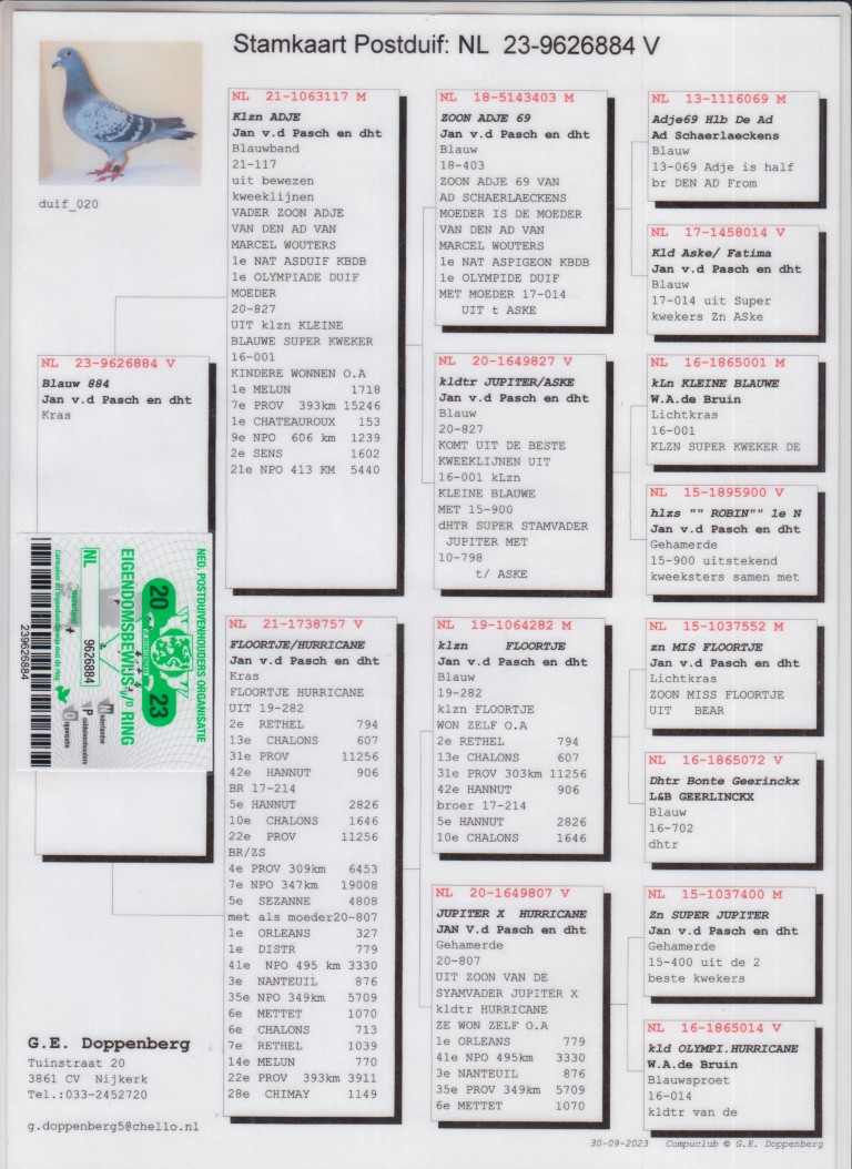 Uit: ”Klz. Adje”, vader 1.-1.718 d., 2.-1.602 d., 9. NPO 1.239 d., lijn ”Den Ad”, 1. Nat. Asduif KBDB & 1. Olympiade duif x ”Floortje / Hurricane”, zus 1.-779 d., 3.-876 d., 5.-4.808 d., 7. NPO 19.008 d., lijn ”Jupiter” & ”Olympic Hurricane”