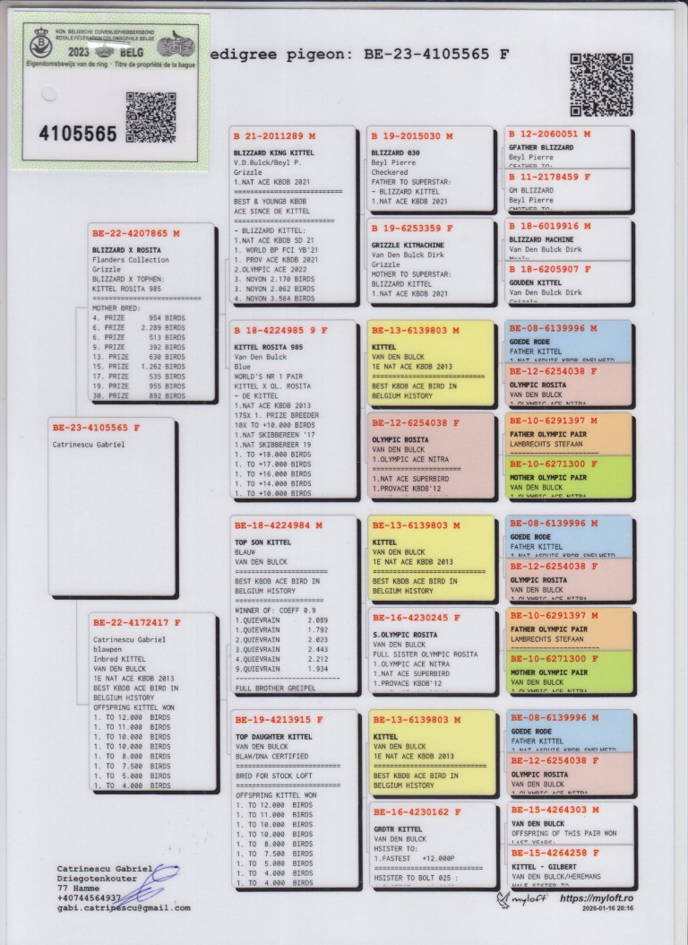 Uit: ”Blizzard x Rosita”, zoon ”Blizzard King Kittel”, 1. Nat. Asduif Sprint KBDB & vader ”Unicum Blizzard”, 1. Nat. Asduif Sprint KBDB, uit dochter ”Kittel” x ”De 417”, uit zoon & dochter ”Kittel”, 1. Nat. Asduif Sprint KBDB