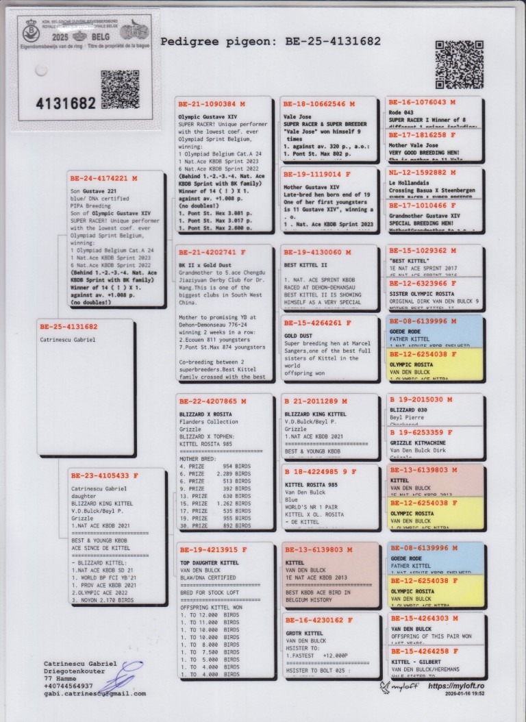 Uit: ”Son Gustave”, zoon ”Olympic Gustave XIV”, 1. & 6. Nat. Asduif KBDB, 1. Olympiade duif, uit dochter ”Best Kittel II”, 1. Nat. Asduif KBDB x ”De 433”, uit zoon ”Blizzard King Kittel”, 1. Nat. Asduif Sprint KBDB, uit dtr. ”Kittel”