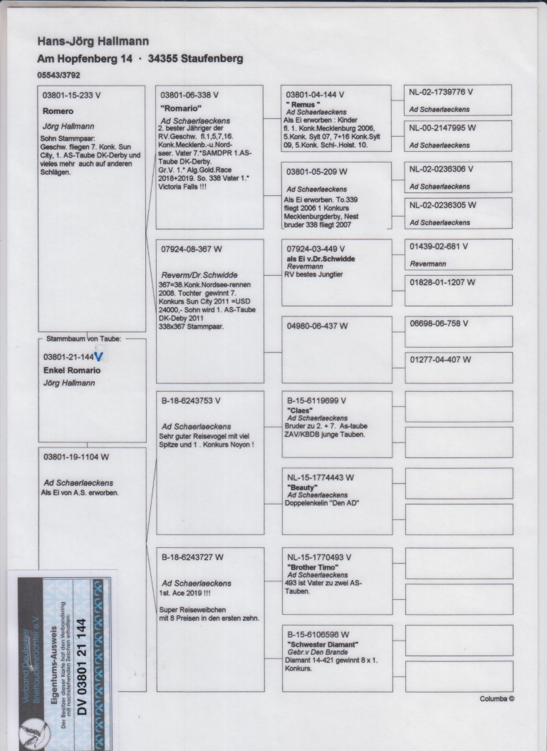 Uit: ”Romero”, zoon ”Romario”, legendarische kweker op de OLR, nazaten winnen: 3x 1. Finale OLR Golden Algarve, 1. Finale OLR Victoria Falls x ”De 1104”, Ad Schaerlaeckens, lijn ”Diamant”, Gebr. v/d Brande