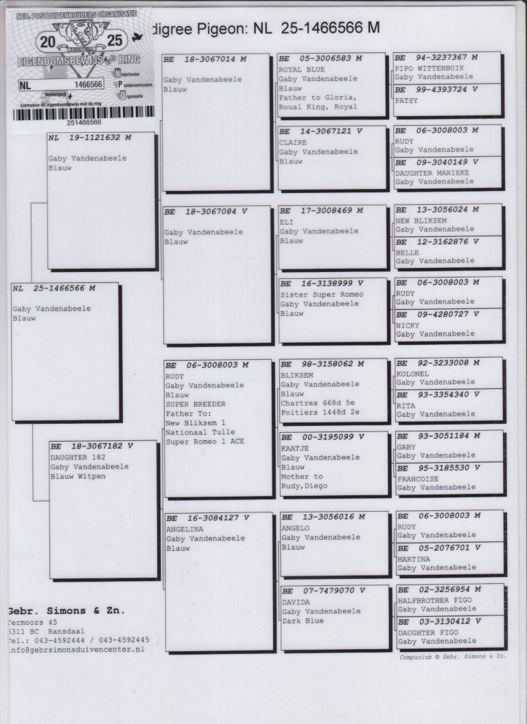 Uit: ”Inteelt Rudy”, Gaby Vandenabeele, inteelt ”Rudy”, Stamduif x ”Daughter 182”, dochter Wereldberoemde ”Rudy”, vader ”Super Romeo”, 1. Nat. Asduif Fond KBDB & ”New Bliksem”, 1. Nat. Tulle KBDB 11.707 d.