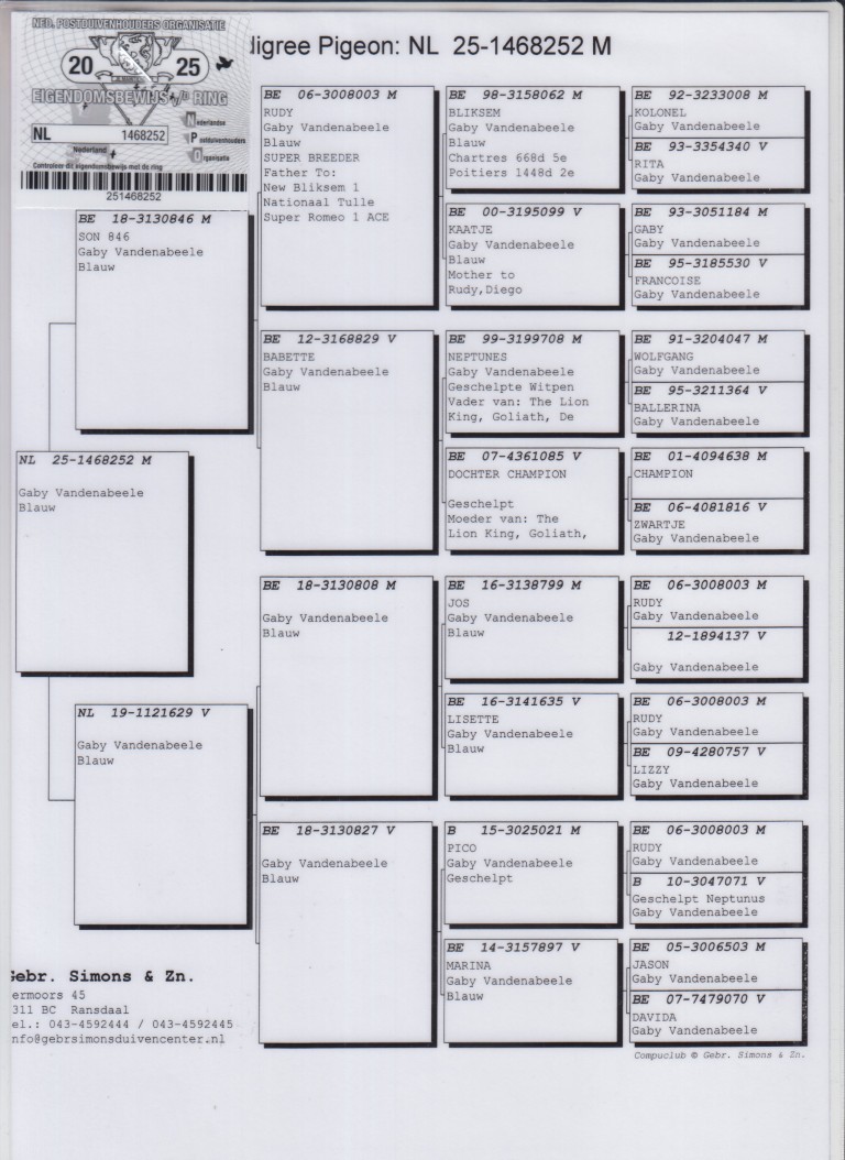 Uit: ”Son 846”, Gaby Vandenabeele, zoon Wereldberoemde ”Rudy”, vader ”Super Romeo”, 1. Nat. Asduif Fond KBDB & ”New Bliksem”, 1. Nat. Tulle KBDB 11.707 d. x ”3x Inteelt Rudy”, inteelt Stamduif Vandenabeele ”Rudy”
