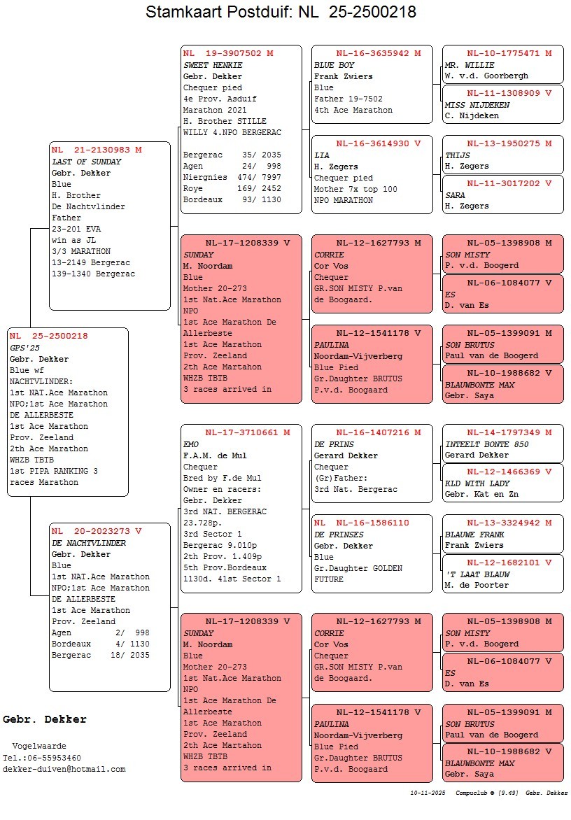 Uit: ”Last Of Sunday”, 1/2 broer ”Nachtvlinder”, 1. Nat. Asduif Marathon NPO x ”De Nachtvlinder”, 1. Nat. Asduif Marathon NPO, 1. Nat. Asduif Allerbeste, 1. Prov. Asduif, 2. NPO Agen, 4. NPO Bordeaux, 18. NPO Bergerac