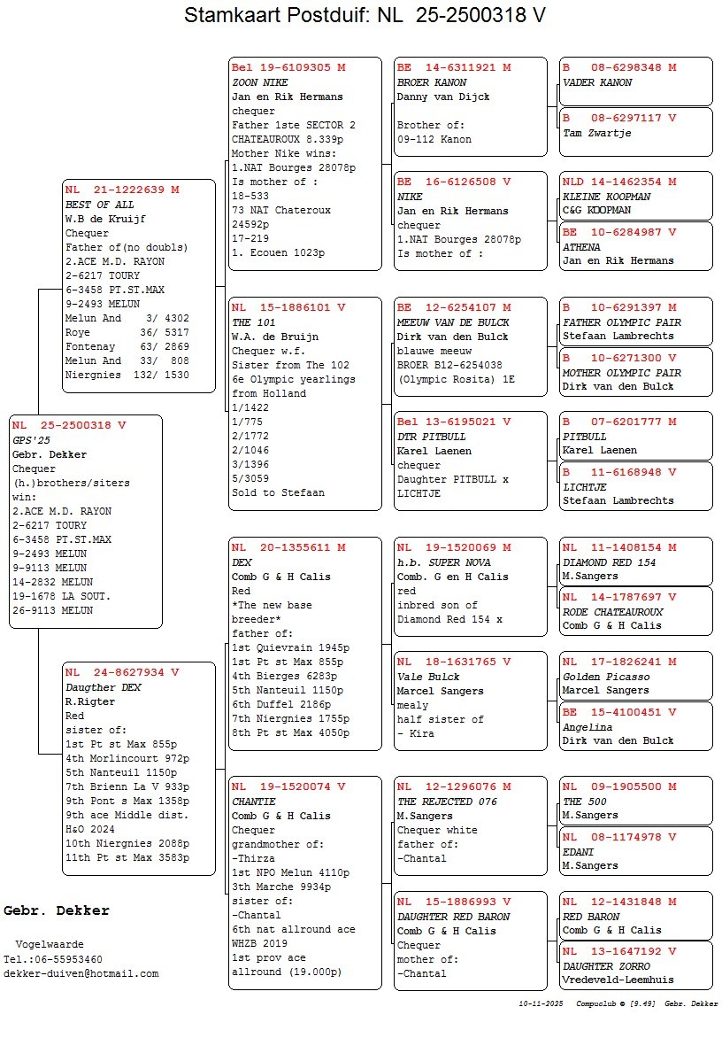 Uit: ”Best Of All”, 3. NPO Melun 4.302 d., vader 2. Prov. Toury 6.217 d., 6. Prov. Pt.St.Max. 3.458 d., 9. NPO Melun 2.493 d., uit zoon ”Nike”, 1. Nat. Bourges x ”Daughter Dex”, zus 1.-855 d., 4.-972 d., 100% G. & H. Calis