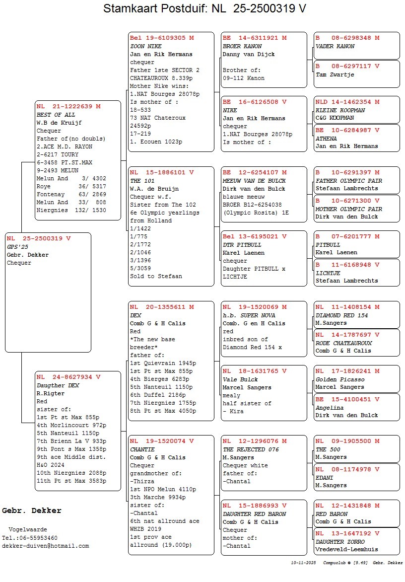 Uit: ”Best Of All”, 3. NPO Melun 4.302 d., vader 2. Prov. Toury 6.217 d., 6. Prov. Pt.St.Max. 3.458 d., 9. NPO Melun 2.493 d., uit zoon ”Nike”, 1. Nat. Bourges x ”Daughter Dex”, zus 1.-855 d., 4.-972 d., 100% G. & H. Calis
