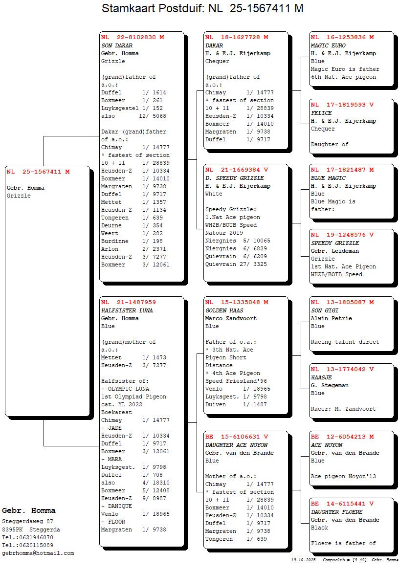 Uit: ”Son Dakar”, vader & gr-vader 1.-1.614 d., 1.-261 d., 1.-152 d., 1/2 broer ”Olympic Luna”, uit dochter ”Speedy Grizzle” x ”Half sister Luna”, moeder & gr-moeder 1.-1.473 d., 3.-7.277 d., 1/2 zus ”Olympic Luna”, 1. Olympiade