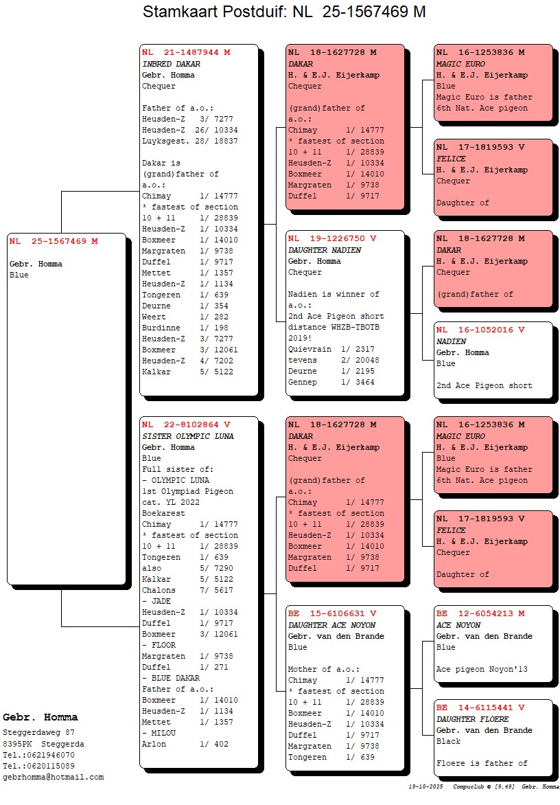 Uit: ”Inbred Dakar”, vader 3. Heusden 7.277 d., zoon stamvader ”Dakar”, vader ”Olympic Luna” x ”Sister Olympic Luna”, zus ”Olympic Luna”, 1. Olympiade duif Cat. Jaarlingen, 1.-28.839 d., 5.-7.290 d., 5.-5.122 d.