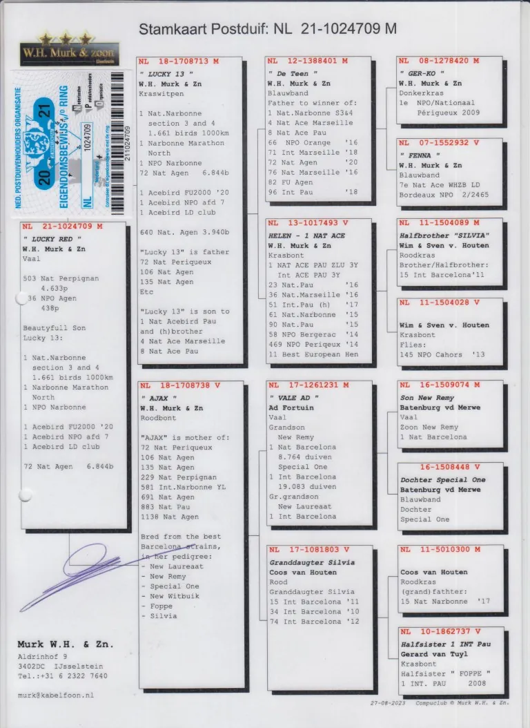 ”Lucky Red”, 503. Nat. Perpignan 4.633 d., uit: ”Lucky 13”, 1. Nat. Sector Narbonne 1.661 d., 1. NPO Narbonne, 1. Inter-Prov. Asduif Int. Vluchten, 1. Prov. Asduif Int. Vluchten x ”Ajax”, lijn ”New Laureaat” & ”Special One”