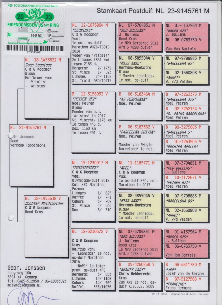 Uit: ”Zoon Leonidas”, zoon ”Leonidas”, 1. Nat. Asduif Marathon WHZB & zoon ”Red Bullens”, 1.-2.-2. NPO x ”Dochter Phidippides”, dochter ”Phidippides”, Olympiade duif Cat. Marathon, 1. NPO Limoges, 1. NPO Ruffec, 3. NPO Cahors