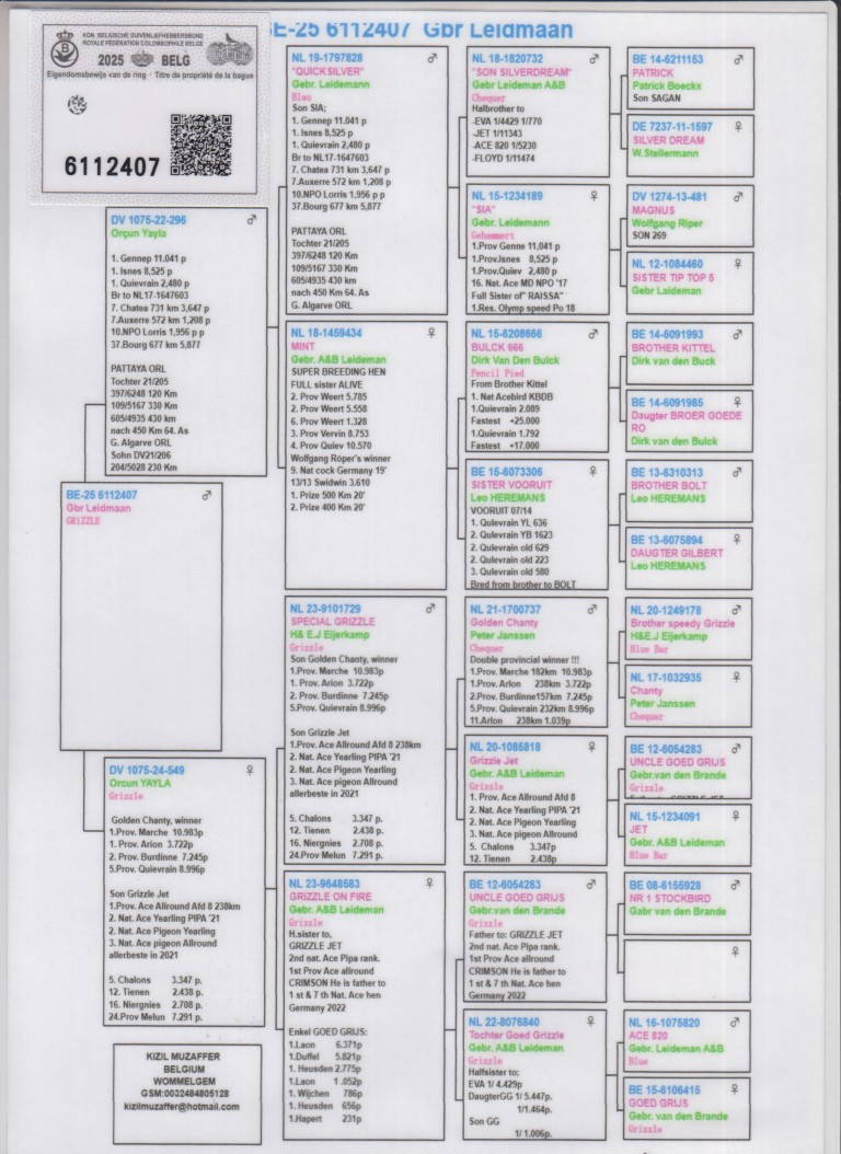 Uit: ”Orçun Yayla”, uit zoon ”Sia”, 1. Gennep 11.041 d., 1. Isnes 8.525 d., 1. Quiévrain 2.480 d. x ”Orçun Yayla”, inteelt ”Goed Grijs”, 7x 1. Prijs & 1. NPO Laon 6.371 d., uit zoon ”Golden Chanty” & ”Grizzle Jet”, 1. Prov. Asduif