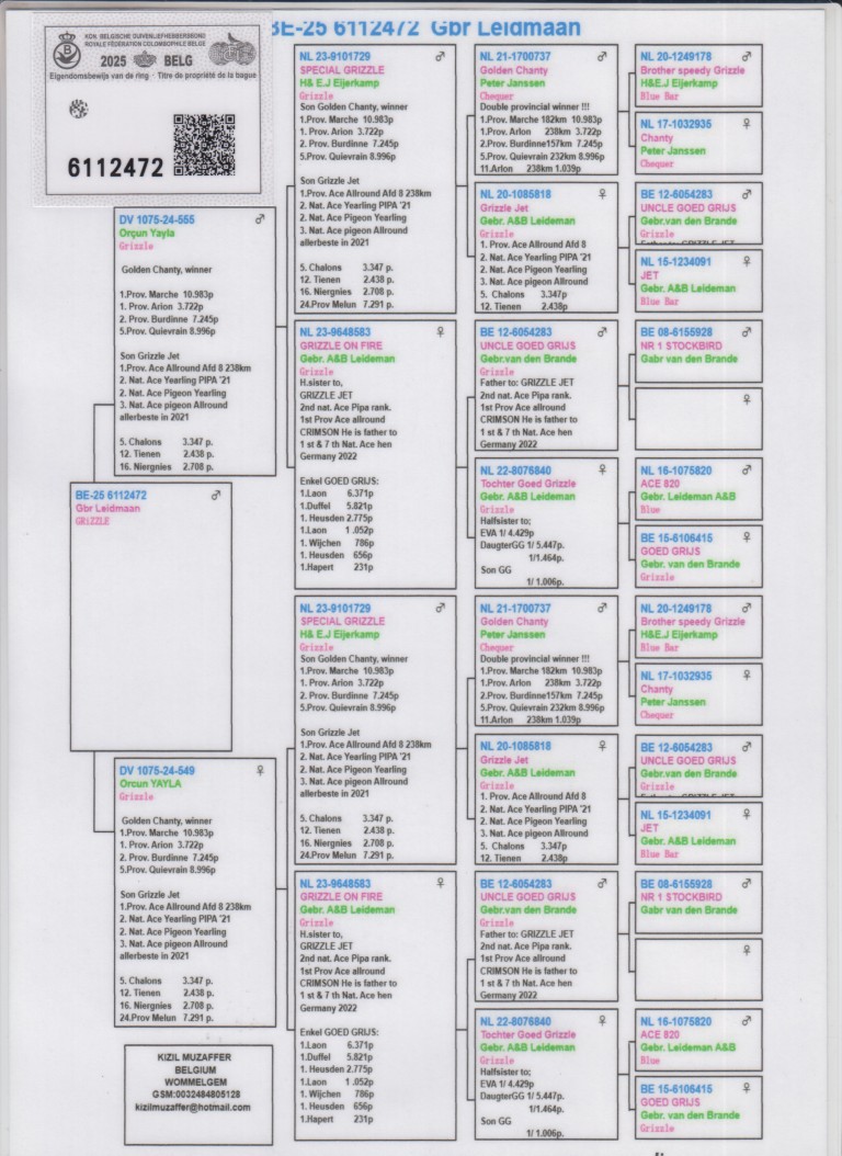 Uit: ”Orçun Yayla”, uit zoon ”Golden Chanty”, 1.-1.-2. Prov. & ”Grizzle Jet”, 1. Prov. Asduif x ”Orçun Yayla”, inteelt ”Goed Grijs”, 7x 1. Prijs & 1. NPO Laon 6.371 d., uit zoon ”Golden Chanty” & ”Grizzle Jet”, 1. Prov. Asduif