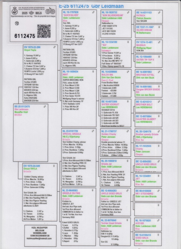 Uit: ”Orçun Yayla”, uit zoon ”Sia”, 1. Gennep 11.041 d., 1. Isnes 8.525 d., 1. Quiévrain 2.480 d. x ”Orçun Yayla”, inteelt ”Goed Grijs”, 7x 1. Prijs & 1. NPO Laon 6.371 d., uit zoon ”Golden Chanty” & ”Grizzle Jet”, 1. Prov. Asduif