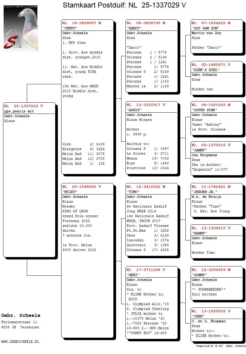 Uit: ”Cento”, 1. Prov. Asduif Jonge Midfond, 1. Gouden Crack, 1. NPO Gien 2.166 d., vader ”Elena”, 1. NPO Chateauroux 3.337 d. x ”Miley”, moeder ”King of Leon”, 1. Nat. Fontenay 10.000 d. (7 min. vooruit), 1. NPO Melun 9.072