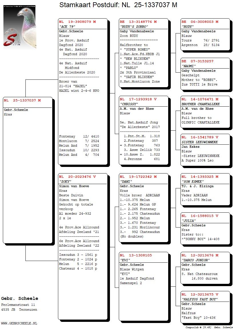 Uit: ”Ace 79”, 1. Prov. Asduif Dagfond, 4. Nat. Asduif Dagfond NPO, 4. Nat. Asduif Midfond, 7. NPO 1.952 d., 7. NPO 2.524 d., 12. NPO 4.410 d. x ”Zoey”, 4. & 6. Prov. Asduif Allround, gr-moeder ”GP 85”, 1. NPO GP Chateaudun