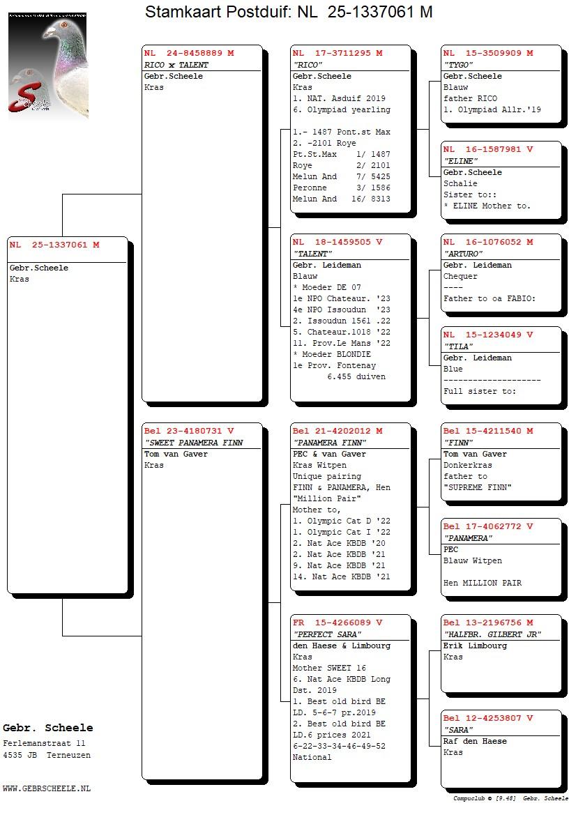 Uit: ”Rico x Talent”, zoon ”Rico”, 1. Nat. Asduif, 1/2 broer ”Blondie”, 1. NPO Fontenay, ”De 07”, 1. NPO Chateauroux x ”Sweet Panamera Finn”, 1/2 zus ”Sweet 16”, 3x 1. Nat. Asduif Fond, uit zoon ”Finn”, Stamvader Tom van Gaver