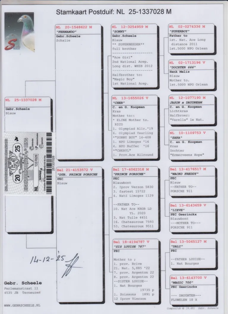 Uit: ”Fernando”, zoon Superkoppel ”Sonny” & ”Cher”, ouders 1. NPO Limoges, 1. Prov. Asduif Allround, gr-ouders 1.-2.-3.-3.-3.-5.-6.-6. Nat. Asduif x ”Dtr. Prince Porsche”, dochter ”Prince Porsche”, OLR Wonderkweker PEC