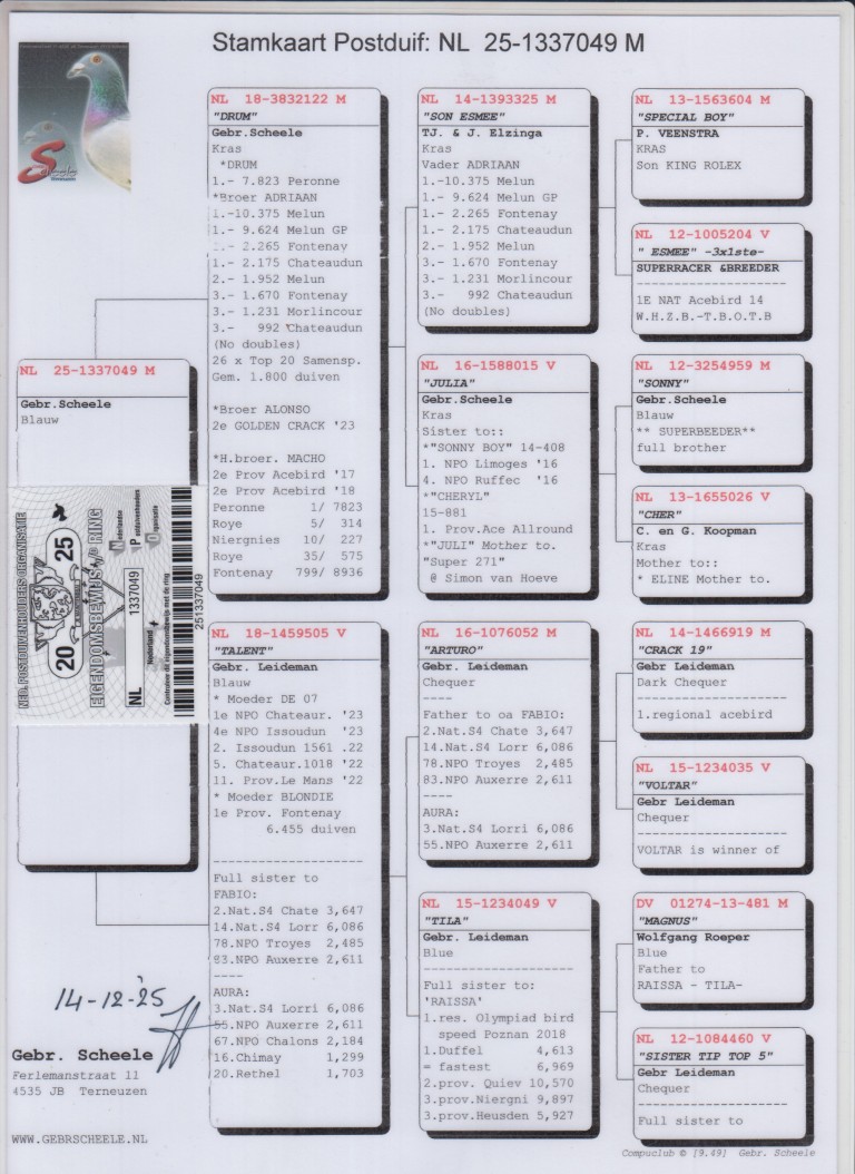Uit: ”Drum”, 1. Prov. Peronne 7.823 d., vader ”Lizzy”, 1. Gouden Crack, broer ”Adriaan”, 3x 1. NPO x ”Talent”, moeder 1. Prov. 6.455 d., 1. NPO Chateauroux, gr-moeder 1. NPO GP Chateaudun, dochter ”Arturo” & ”Tila”