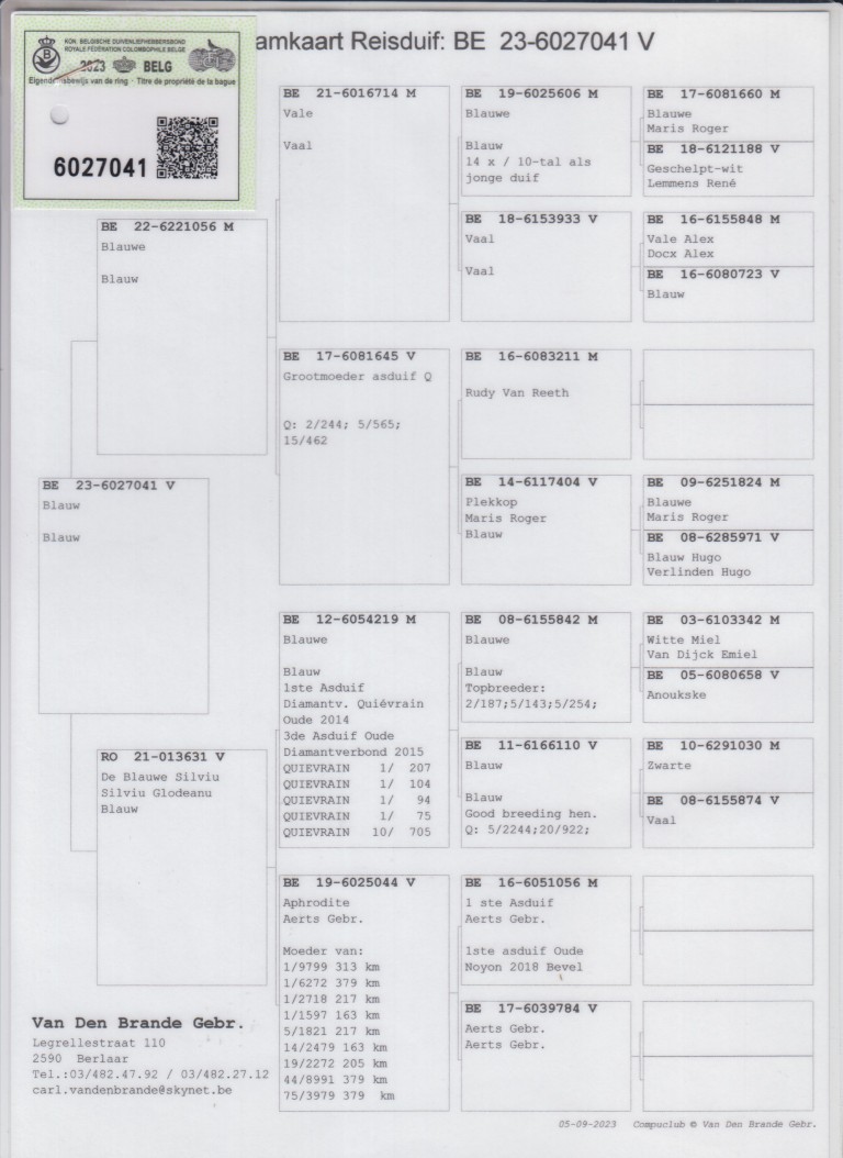 Uit: ”Blauw 056”, zoon ”De 645”, 2.-244 d., 5.-565 d. x ”Do. Blauwe Silviu”, 1/2 zus 1.-9.799 d., 1.-6.272 d., 1.-2.718 d., 1.-1.597 d., dochter ”Blauw 219”, 1. Asduif Diamantverbond 2014, 3. Asduif Diamantverbond 2015, 4x 1. Prijs