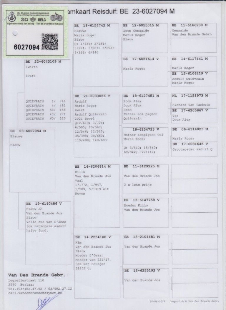 Uit: ”Zwarte 109”, 1.-746 d., 4.-482 d., zoon ”Blauw 742”, 1.-139 d. & ”Asduif”, 1. Asduif Quiévrain Bevel x ”Blauw Jo”, zus ”D’Jess”, 3. Nat. Asduif KHF KBDB, 1/2 zus 3. Nat. Bourges 38.456 d., dtr. ”Killo”, 1.-1.772 d., 1.-947 d., 1.-589 d.
