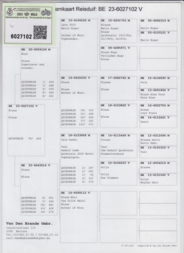”De 102”, 76.-449 d., uit: ”Wout”, 1.-403 d., 3.-468 d., 6.-639 d., 8.-444 d., 8.-401 d. x ”De 016”, 5.-496 d., 8.-951 d., dochter ”Vale Raket”, 1. Asduif Quiévrain Bevel, 1.-95 d., 2.-207 d., 2.-201 d., 2.-147 d. & zoon ”Piraat”