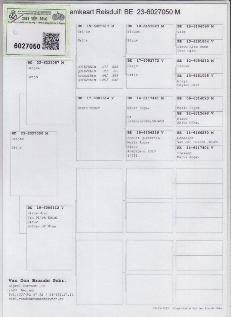 Uit: ”Grijze 057”, zoon ”Grijze 617”, 12.-151 d., 17.-555 d., uit dochter ”Asduif Quiévrain”, 1. Asduif Quiévrain, lijn ”Grijs Gert Heylen”, ”Genaaide”, ”Blauwe 213”, ”Blauw Alex” x ”Blauw Miel”, Emiel van Dijck, moeder ”Nina”