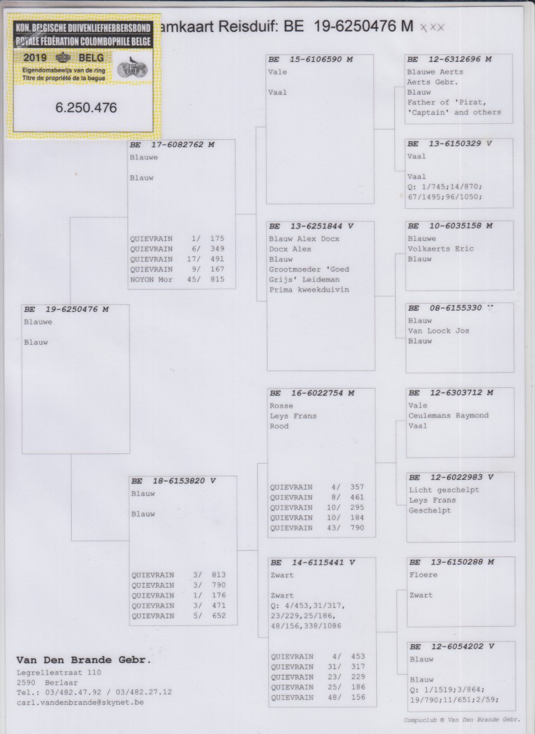 Hij komt uit: BE12-6312696 “Blauwe Aerts”, Gebr. Aerts, vader “Pirat”, “Captain” etc.