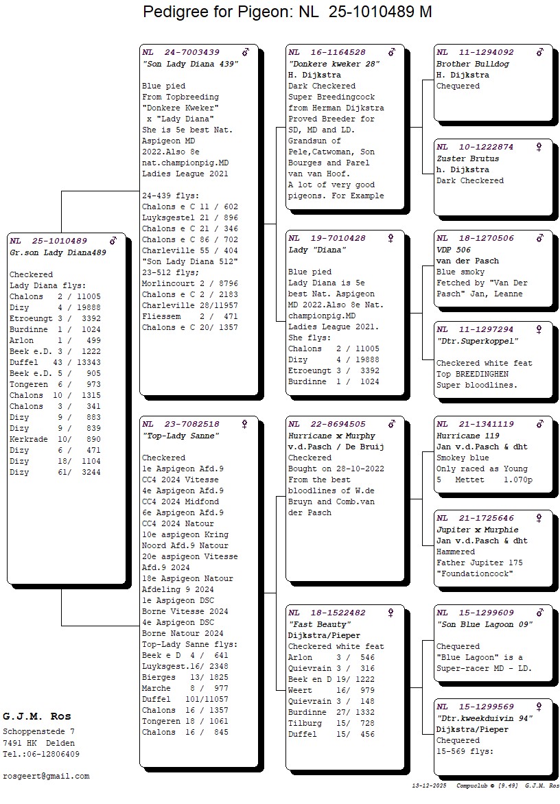 Uit: ”Son Lady Diana 439”, 11.-602 d., 21.-896 d., 21.-346 d., zoon ”Lady Diana”, 1.-1.024 d., 1.-499 d., 2.-11.005 d. x ”Top-Lady Sanne”, 1. Asduif Vitesse, 4.-641 d., 8.-977 d., 16.-2.348 d., 16.-1.825 d., 16.-1.357 d., 16.-1.061 d.