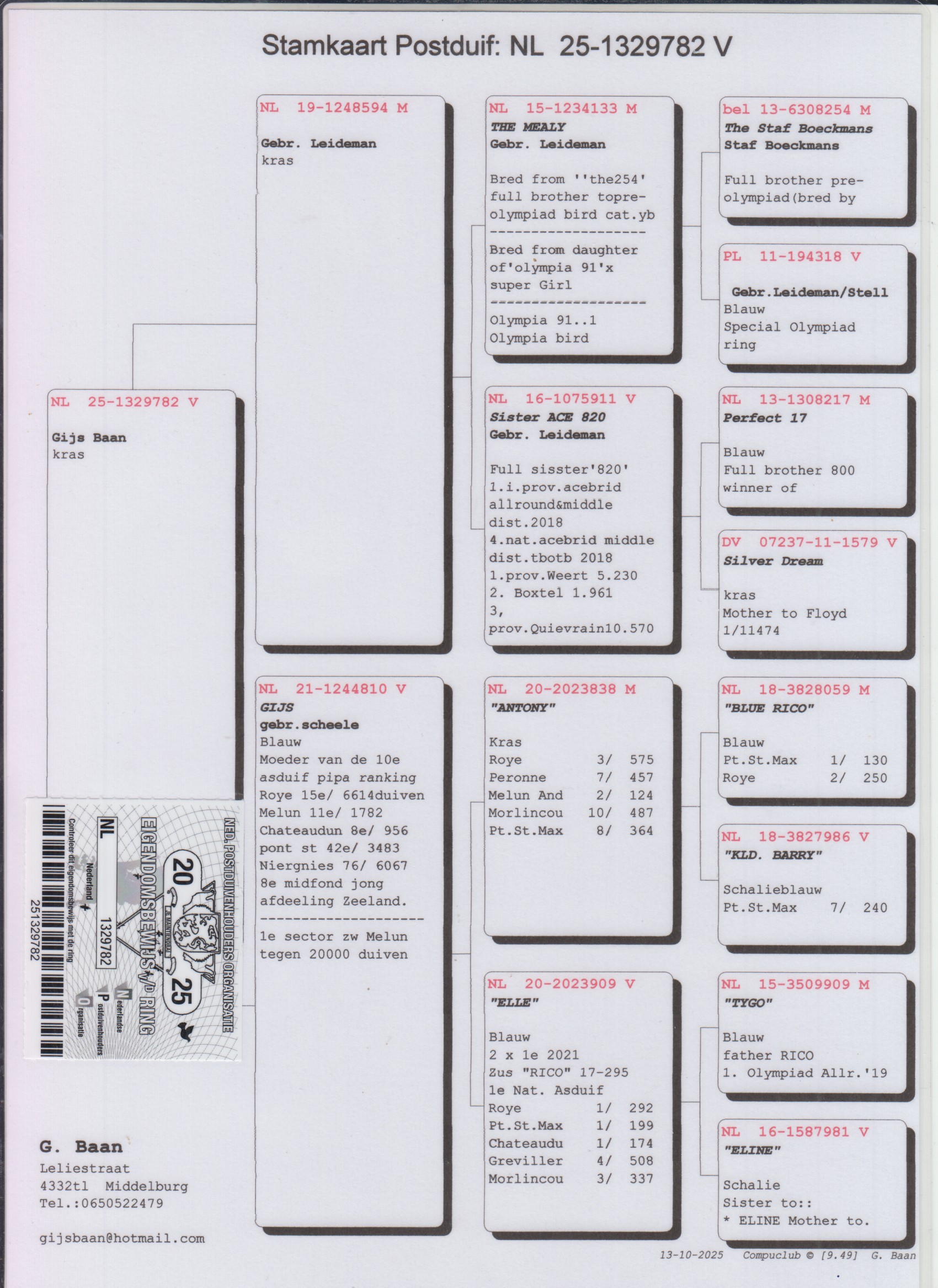 Uit: ”Leideman 594”, uit zus ”Ace 820”, 1. Inter-Prov. Asduif Allround, 4. Nat. Asduif Midfond, vader ”Grizzle Mama”, moeder ”Grizzle Best Kittel”, 2. Nat. Asduif KBDB x ”Gijs”, moeder 1. Inter-Prov. Melun 20.000 d., 10. Nat. Asduif