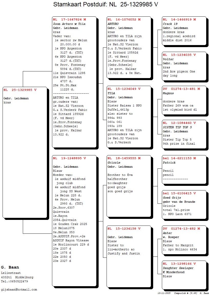 Uit: ”Zoon Arturo x Tila”, vader 1. Inter-Prov. Melun 20.000 d., 1. & 6. NPO Argenton 3.127 d., zoon ”Arturo” & ”Tila” x ”De 895”, moeder 1. Gouden Crack Jonge 2025, 2. Prov. Asduif Vitesse, uit zoon ”Goed Grijs”