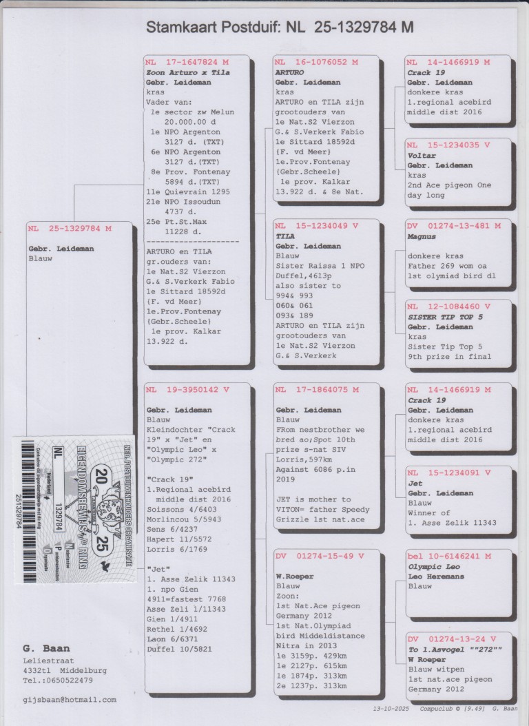 Uit: ”Zoon Arturo x Tila”, vader 1. Inter-Prov. Melun 20.000 d., 1. & 6. NPO Argenton 3.127 d., 8. Prov. Fontenay 5.894 d., zoon ”Arturo” & ”Tila” x ”De 142”, uit zoon ”Crack 19”, vader ”Arturo”, stamvader Gebr. Leideman