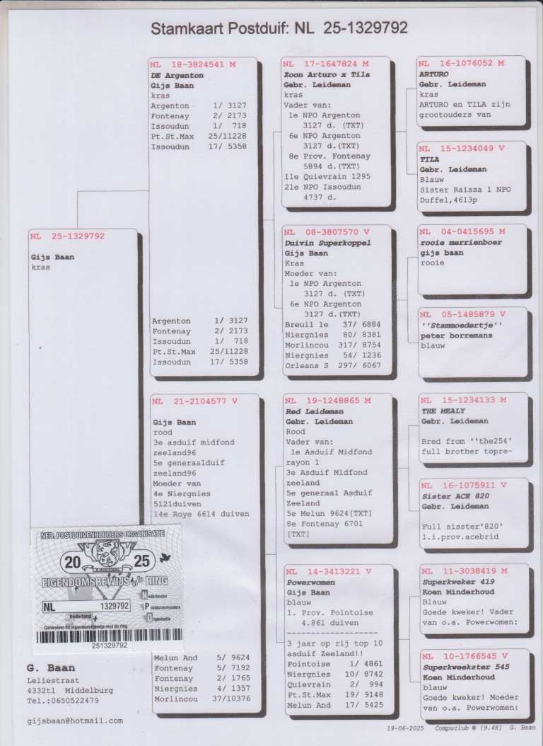 Uit: ”De Argenton”, 1. NPO Argenton 3.127 d., 1. Issoudun 718 d., 2. Fontenay 2.173 d., uit zoon ”Arturo” & ”Tila” x ”De 577”, 3. Prov. Asduif Midfond, 5. Prov. Asduif Allround, 50% Gebr. Leideman, moeder 4. Niergnies 5.121 d.
