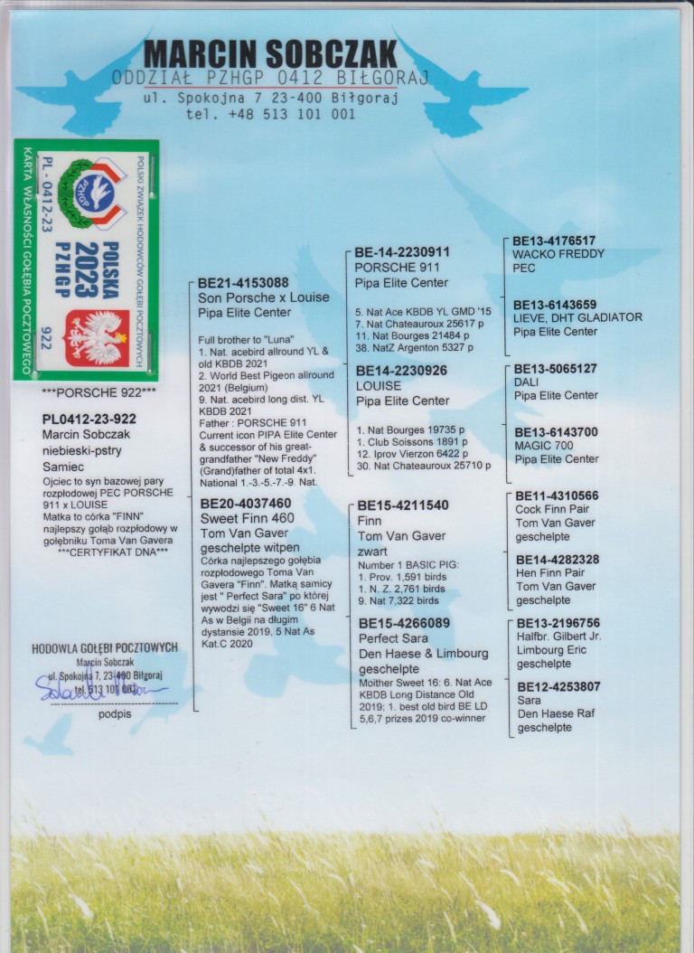 Uit: ”Son Porsche x Louise”, zoon ”Porsche 911”, 5. Nat. Asduif KBDB & PEC Superkweker, zoon ”Louise”, 1. Nat. Bourges 19.735 d. x ”Sweet Finn 460”, dochter Unieke Stamvader Tom van Gaver ”Finn” & ”Perfect Sara”