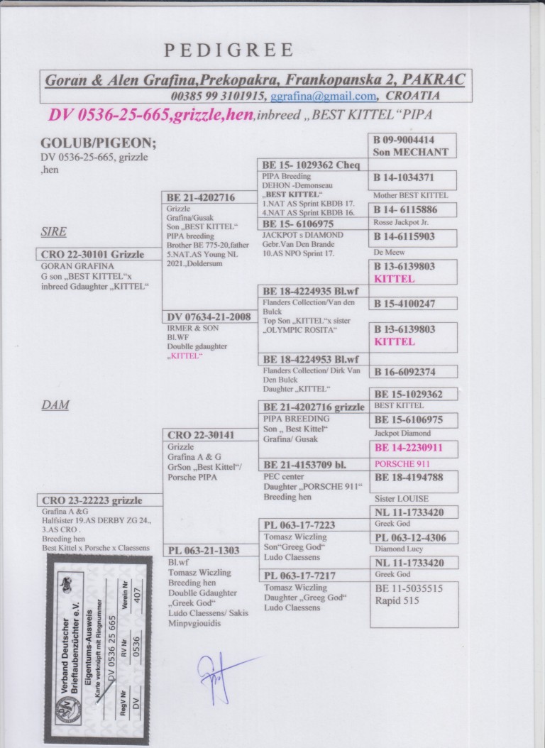 Uit: ”G.son Best Kittel”, uit zoon ”Best Kittel”, 1. & 4. Nat. Asduif Sprint KBDB & ”Jackpot’s Diamond”, 10. Nat. Asduif Sprint NPO x ”Half sister 19. Asduif Derby ZG”, uit klz. ”Best Kittel” & ”Porsche 911”, 5. Nat. Asduif KBDB