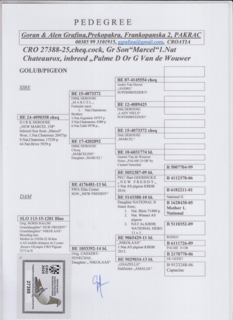 Uit: ”New Marcel 358”, zoon ”Marcel”, 1. Nat. Chateauroux KBDB x ”Granddaughter New Freddy”, uit zoon ”New Freddy”, 1. Nat. Asduif Grote Halve Fond KBDB, uit dochter ”Nikolaas”, 1. Nat. Asduif KBDB 2013