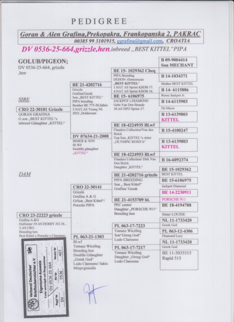 Uit: ”G.son Best Kittel”, uit zoon ”Best Kittel”, 1. & 4. Nat. Asduif Sprint KBDB, uit zoon & dochter ”Kittel”, 1. Nat. Asduif Sprint KBDB x ”Grizzle 223”, uit klz. ”Best Kittel” & ”Porsche 911”, 5. Nat. Asduif KBDB & Stamduif PEC