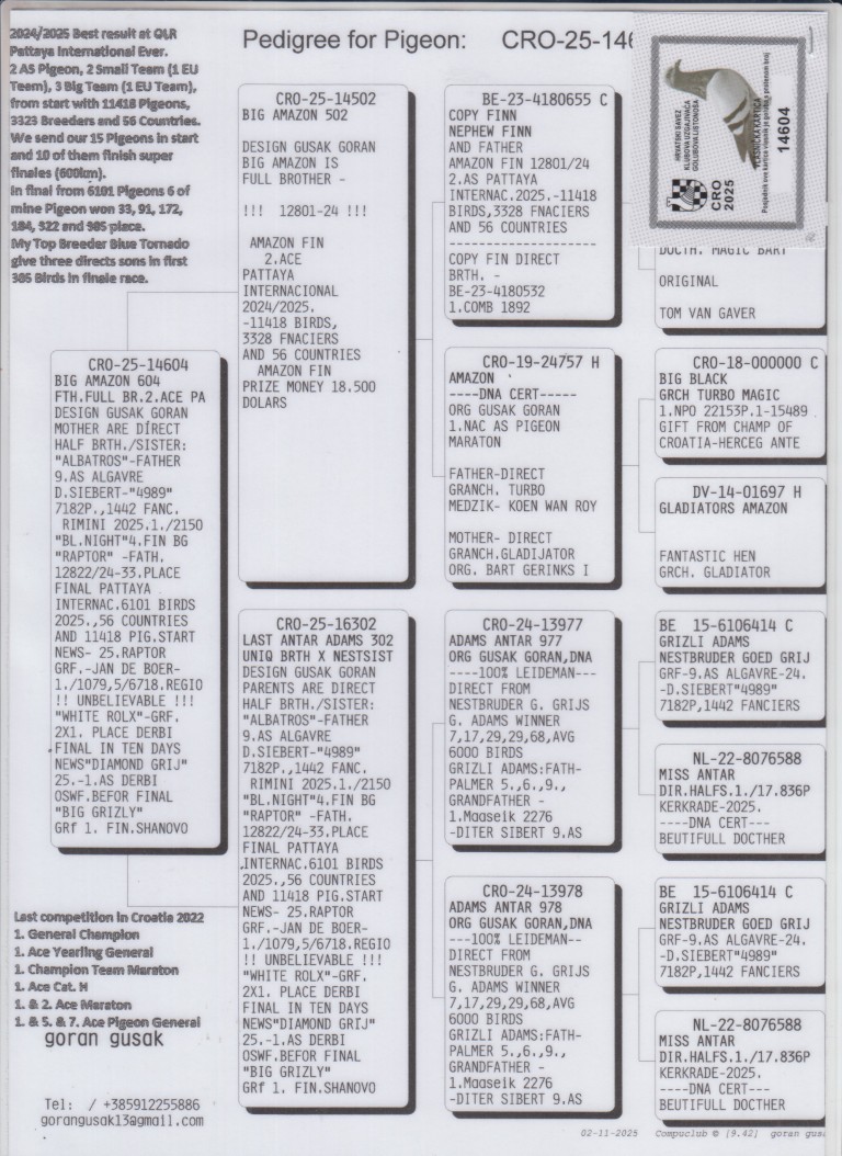 Uit: ”Big Amazon”, broer 2. Finale OLR PIPR Pattaya (startend met 11.418 d.), zoon ”Amazon”, 1. Nat. Asduif x ”Last Antar Adams”, uit zoon & dtr. ”Grizli Adams”, nazaten: 1. & 2. OLR Finale As Croatia, 1. OLR Finale Derby Belgrade