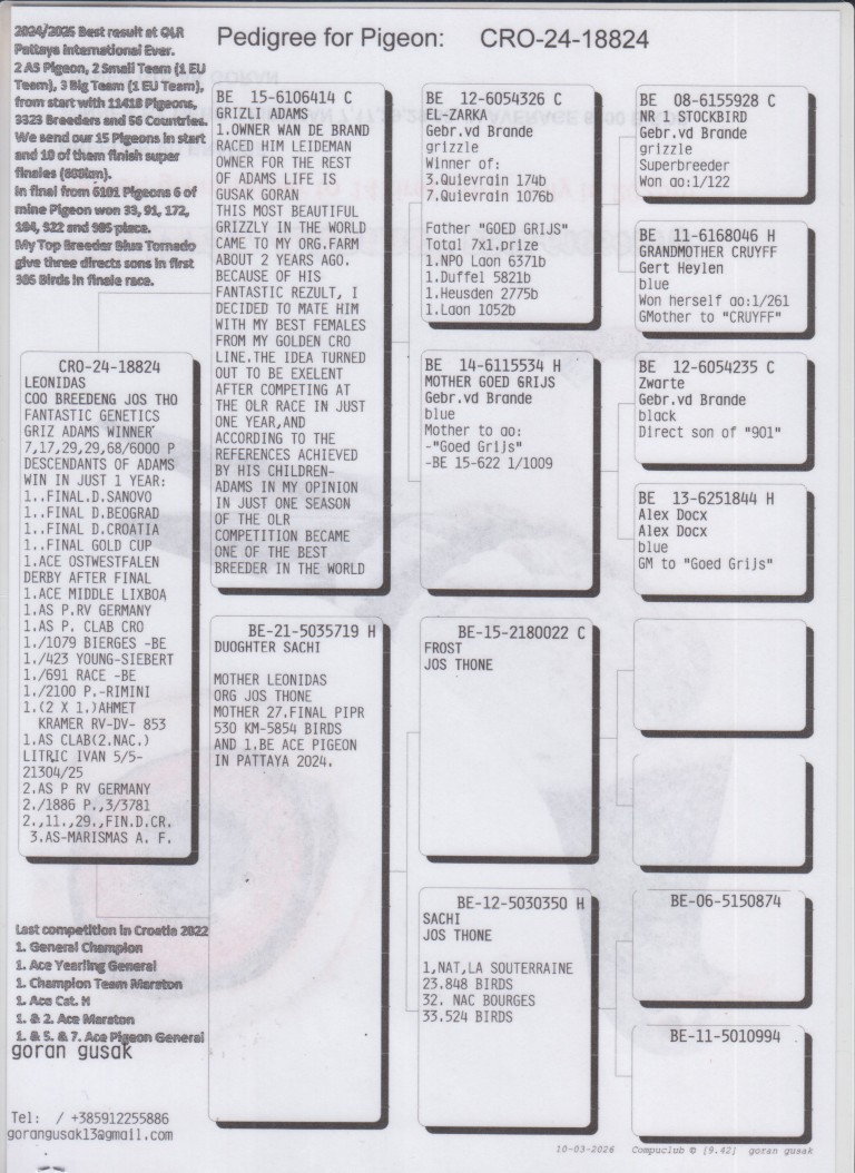 Uit: ”Grizli Adams”, nazaten winnen 1. & 2. OLR Finale As Croatia, 1. OLR Finale Derby Belgrade, 1. OLR Hotspot Fast Rimini, 9. Asduif OLR Golden Algarve, nestbroer ”Goed Grijs” x ”Daughter Sachi”, Jos Thoné, dochter ”Sachi”