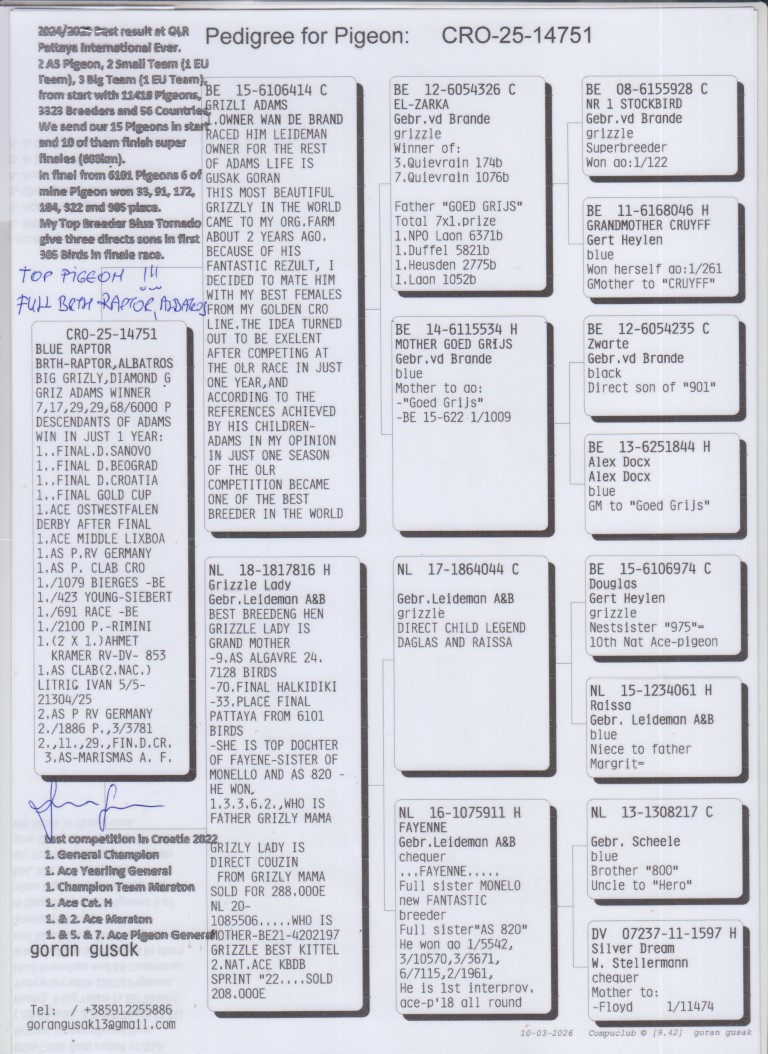 Uit: ”Grizli Adams”, nazaten winnen 1. & 2. OLR Finale As Croatia, 1. OLR Finale Derby Belgrade, 1. OLR Hotspot Fast Rimini, 9. Asduif OLR Golden Algarve, nestbroer ”Goed Grijs” x ”Grizzle Lady”, Gebr. A. & B. Leideman