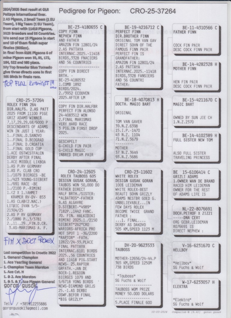 Uit: ”Copy Finn”, vader ”Amazon Finn”, 2. Asduif OLR PIPR Pattaya startend met 11.418 d., uit broer ”Finn”, Stamvader Tom van Gaver x ”Rolex Tauboss”, uit zoon ”Grizli Adams”, Superkweker & nestbroer ”Goed Grijs”