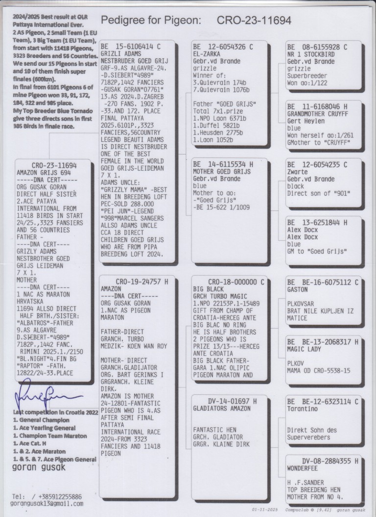 Uit: ”Grizli Adams”, nazaten winnen 1. & 2. OLR Finale As Croatia, 1. OLR Finale Derby Belgrade, 1. OLR Hotspot Fast Rimini, nestbroer ”Goed Grijs” x ”Amazon”, 1. Nat. Asduif Marathon & moeder 2. Asduif OLR PIPR Pattaya
